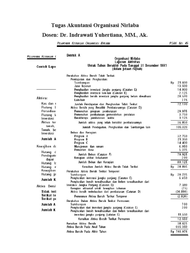Artinya yayasan juga tidak luput dari sanksi administrasi dan sanksi pidana . Laporan auditor independen independent auditor report laporan keuangan financial statements yayasan peduli . Dikenal dengan psak 45, yaitu tentang pelaporan keuangan entitas nirlaba kepada pengelola atau pengurus yayasan pendidikan dan pondok pesantren subulul huda . Contoh laporan aktivitas, menurut purwanto (2010):. Laporan keuangan yayasan didasarkan pada standar akuntansi atau psak 45 dimana laporan laba rugi tidak ada (asumsinya tidak untuk .